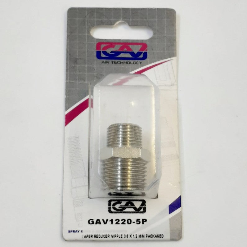 The GAV Nipple GAV1220-5P 3/8 ร 1/2 M/M is a threaded adapter designed to connect a 3/8" male-threaded component to a 1/2" female-threaded component in pneumatic, hydraulic, or fluid systems.